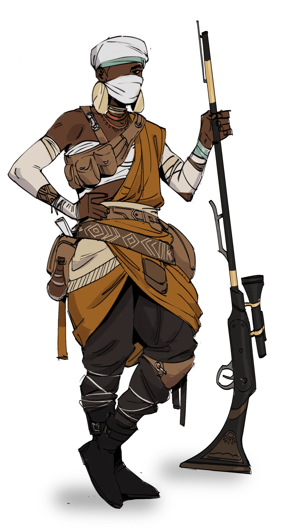Nkotobek are elite survivalists and master marksmen, renowned for their unmatched precision with the Moukahla firearm. Known as “the one that doesn’t miss,” these warriors are highly respected guides, fluent in many languages, and skilled in navigating the diverse and dangerous terrains of Zairoo. They are equipped with the best survival gear from every culture across the continent.